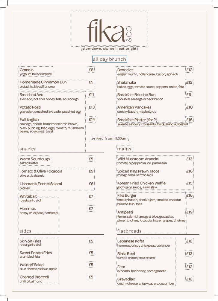 All Day Brunch Menu Make a Booking Fika Vouchers Links Home Menus Booking Vouchers Privacy Contact Us Call: 01642609341 Email: info@fikaco.com 7 High Street Norton, TS20 1AH FollowFollowFollowFollow Opening Hours Monday 8am – 4pm Tuesday Closed Wednesday 8am – 4pm Thursday 8am – 10pm Friday 8am – 10pm Saturday 9am – 10pm Sunday 9am – 2pm